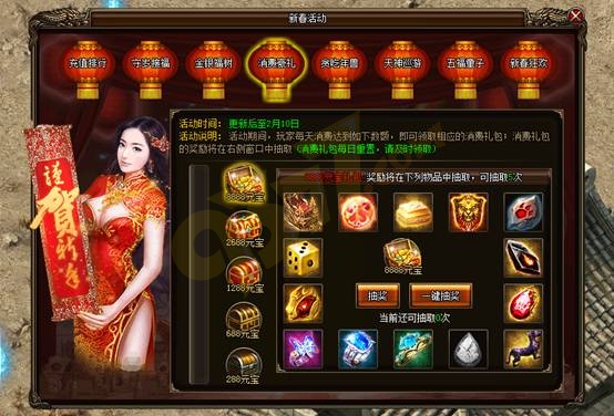 活动内容:活动期间,玩家每天消费达到一定数额,可进行相应等级的礼包抽奖,消费礼包的奖励将通过转盘每次抽取其中一件。(消费礼包每日重置,请及时领取)