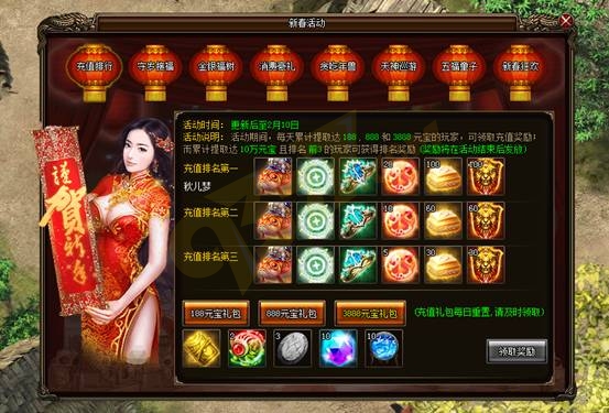活动奖励:麻痹戒指、护体戒指、复活戒指、羽炼石、兽灵、战神结晶、血元、共鸣结晶、倒福、一亿经验灵符、喜庆鞭炮、图鉴金包、图鉴银包、图鉴铜包、隐龙鉴。