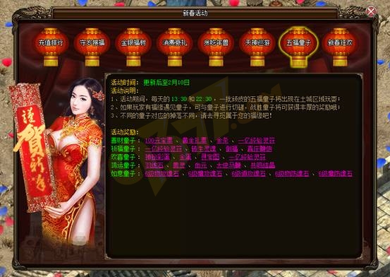 作为一名热血男子,想必你一定还记得小时候看的五色战队!而在《烈火战神》中也有一样厉害的五福童子哦!春节期间,五福童子将现身玛雅大陆,与各位英雄豪杰切磋武艺!