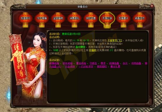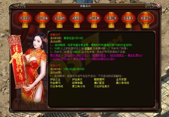 活动内容:活动期间,每天11:30和19:30,天神将出现在王城皇宫门口,并开始巡视人间。天神巡游期间,玩家可跟随着天神巡游,并捡取天神洒落的奖励。玩家可以在天神附近燃放喜庆鞭炮,将有可能获得天神的嘉奖。50级以上的玩家每天可以在土城祈福树处免费领取2个喜庆鞭炮,也可以直接购买或通过其他线上活动获得。