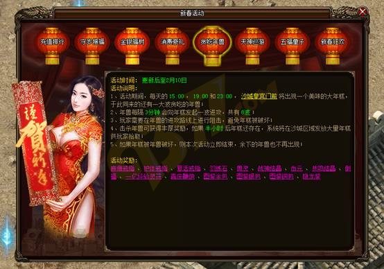 活动内容:活动期间,每天15:00,19:00和23:00,沙城皇宫门前将出现一个美味的大年糕,与此同来的还有一大波贪吃的年兽。年兽每隔3分钟会向年糕发起一波进攻,共有8波。玩家需要在年兽的进攻路线上进行阻击,避免年糕被破坏。击杀年兽可获得丰厚奖励,如果半小时后年糕还存在,系统将在沙城区域发放大量年糕供玩家拾取。如果年糕被破坏,则本次活动立即结束,余下的年兽也不再出现。