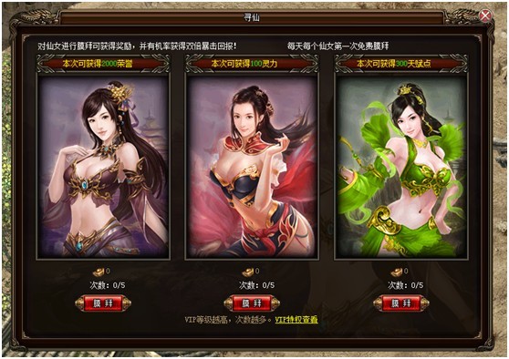 活动介绍:活动期间,玩家可通过游戏上方“寻仙”按钮打开活动界面,50级以上玩家可参加。通过膜拜不同的仙子可分别获得荣誉、灵力、天赋点奖励。每天每个仙子有一次免费膜拜机会,膜拜获得灵力需要1转以上,膜拜获得天赋点需要3转以上。每天每个仙子膜拜有次数限制,提高VIP等级可增加相应次数。