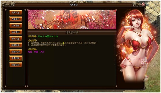 活动介绍:活动期间,夫妻关系双方可在王城红娘处领取婚车进行巡游,双方必须组队,通过婚车巡游双方可获得丰厚的奖励。