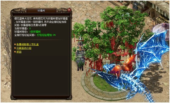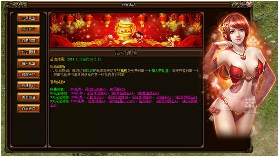 活动介绍:活动期间,等级达到50级的玩家每天可在祈福树处免费领取一个情人节礼盒。每天只能领取一个;双击礼盒使用道具可选择任意一种礼包进行领取。