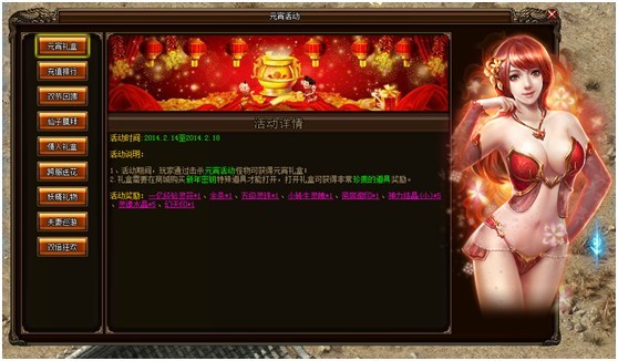 活动奖励:五级灵珠*1、元宵礼盒*1、火蝎灵魄*1、天赋丹*1、血元*1、超级红玫瑰*1、转生灵魄*1、灵力丹(大)*1、999朵红玫瑰*1、99朵红玫瑰*1、9朵红玫瑰*1.