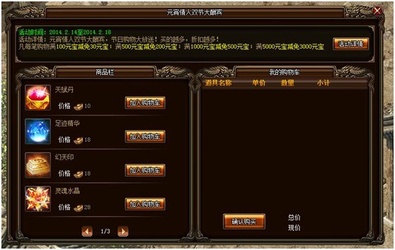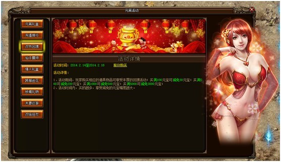 活动介绍:活动期间,玩家购买相应的道具物品可享受回馈活动:买满100可减免30元宝;买满500可减免200元宝;买满1000可减免500元宝;买满5000可减免3000元宝。