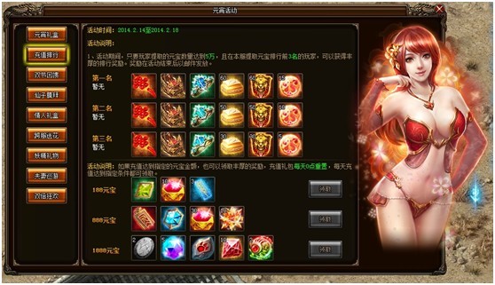 活动介绍:活动期间,只要玩家提取数量达到5万,且在本服提取元宝排行前3名,即可获得丰厚排行奖励。奖励在活动结束后以邮件发放。此外还有每日充值礼包,如果充值达到指定的元宝金额,也可以领取丰厚的奖励,充值礼包每天0点重置,每天充值达到指定条件即可领取。