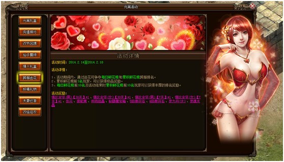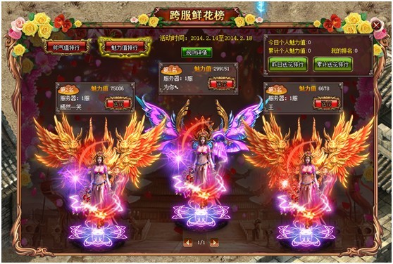 活动介绍:活动期间,通过送花可争夺每日鲜花榜和累积鲜花榜排名。累积鲜花榜排名前3名玩家,可以获得极品奖励。每日鲜花榜前10名及活动结束时累积鲜花榜前10名玩家可获得丰厚排名奖励。