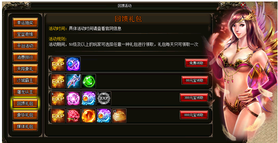 活动内容:活动期间,50级及以上玩家每天可从4种礼包中选取1种进行领取,每天只能领取一次。充值额度越高,可选择的礼包越丰厚!