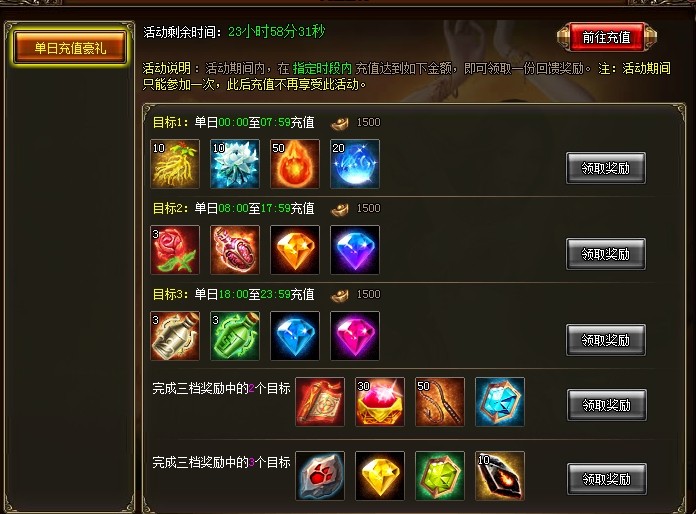 2、当日充值达到当日时段内2种或者3种奖励时,可额外领取一份丰厚大礼。
