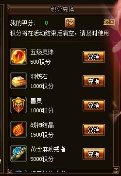 6、 活动期间,累计积分达到10000的玩家将自动进入积分排行榜,活动结束后,系统将根据排行榜的排序发放相应的奖励;(累计积分不受兑换行为影响)