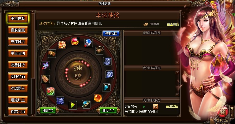 1、 活动开启后,玩家可在界面中进行抽奖,每次消耗20元宝,可获得20积分;