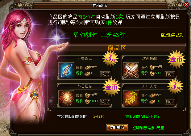 神秘商店中有4件打折特价商品出售。商品区的物品每2小时自动刷新一次,您也可以通过“立即刷新”按钮进行刷新,每次刷新可从四件商品中挑选其中一件购买。