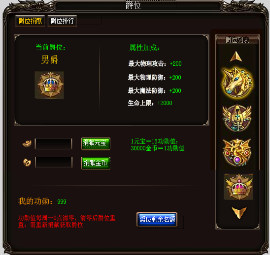 国王、公爵、侯爵、伯爵等等8个爵位候选人即将开始选拔。拥有爵位可以让你获得不俗的属性加成,更重要的,是无上的荣誉封号(血条左方将有爵位标志)。你可以通过捐献元宝和金币来提升功勋值,这将是决定你爵位高低的必备条件。