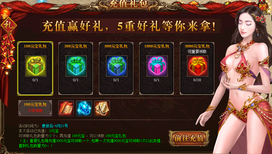 活动内容:梯度礼包分为5个不同阶段的礼包、分别为:188元宝礼包、388元宝礼包、888元宝礼包、1888元宝礼包、3000元宝礼包;重复礼包没充值3000元宝可领取一个,如果一次充值9000元宝可领取3次,最高可以重复领取10次