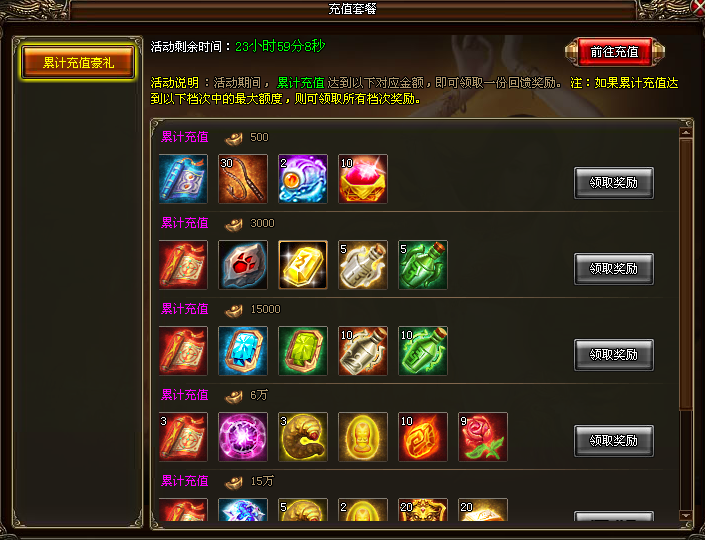 1、累积充值分为500、1000、3000、10000、20000、100000的充值档次,活动期间内玩家累积充值达到对应的金额,即可领取相应奖励。(金额根据需要配置)
