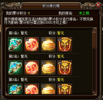 活动期间,累计积分达到10000的玩家将自动进入积分排行榜,活动结束后,系统将根据排行榜的排序发放相应的奖励;(累计积分不受兑换行为影响)