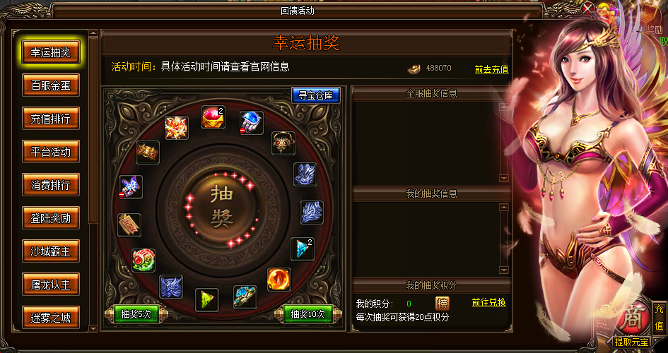 活动开启后,玩家可在界面中进行抽奖,每次消耗20元宝,可获得20积分;
