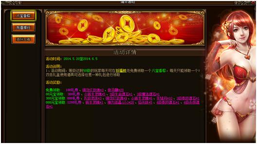 1) 八宝香粽:端午节活动期间,50级以上的玩家可以每天到祈福树领取一个八宝香粽,双击礼盒使用道具可以选择任意一种礼包进行领取