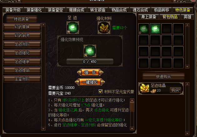 王者之路,始于足下!足迹强化将为你带来前所未有的提升,高强化等级的足迹还有特殊属性加成,还等什么!