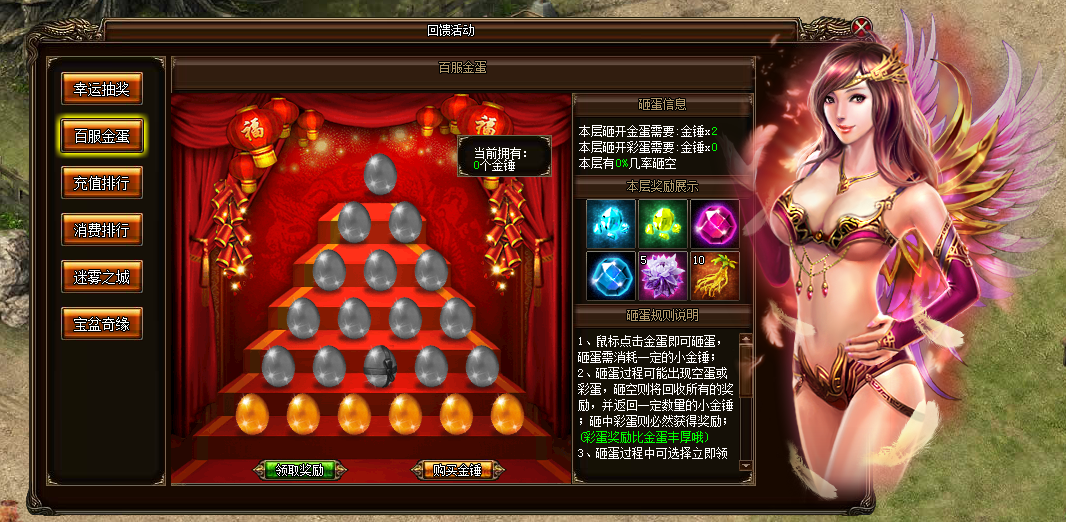 活动内容:小百服砸金蛋,使用小金锤砸蛋每层都有一次砸蛋机会,砸出礼品后可以选择砸下一层或直接领取已砸出奖励,除最后一层外,每一层都会有一个空蛋,砸到空蛋则回收所有奖励重新开始砸蛋,并返还一定量的小金锤。越高层的金蛋砸出的奖励价值越高哦!