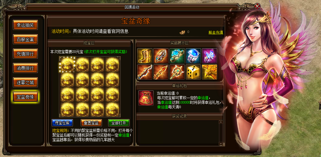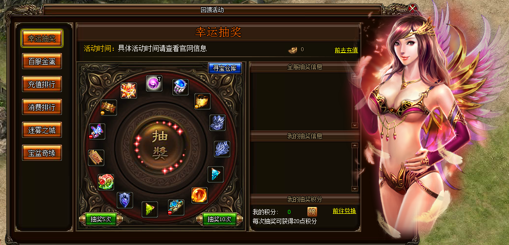 活动内容:活动期间玩家每花费20元宝即可抽奖一次。运气是实力的一部分,来验证你的实力是否胜人一筹吧!