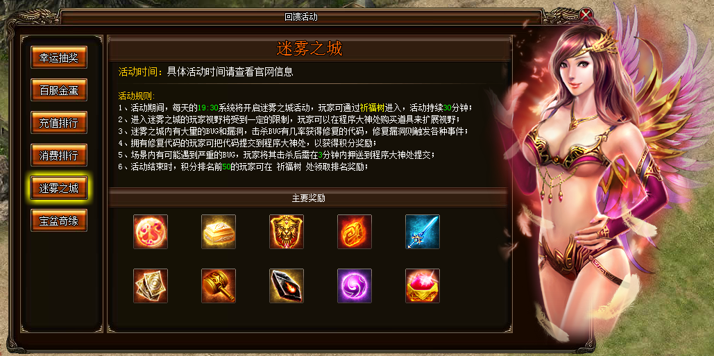 活动内容:烦人的BUG人人得以诛之,让我们都行动起来,深入迷雾之城扫BUG夺秘宝!活动期间每天19:30玩家可以通过祈福树进入迷雾之城,通过击杀BUG、漏洞、押送严重BUG、提交修复代码等方式获得积分,活动结束时积分排名前50的玩家可以获得相应奖励。
