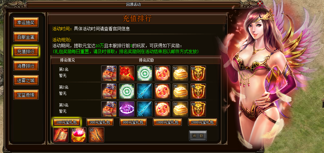 1.在活动期间内,当天消费元宝排行前10的玩家且最低消费1000元宝都可以获得对应的奖励,奖励会在第二天发放,玩家上线就会在任务栏的右侧收到奖励提示。请给予背包足够的空间