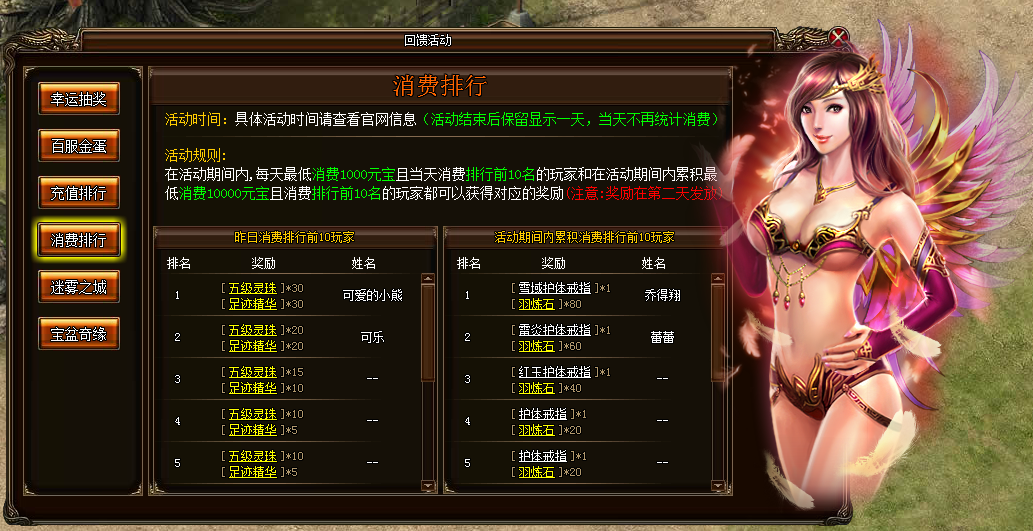 2.在活动期间内,累积消费元宝排行前10的玩家且最低消费10000元宝都可以获得对应的奖励,奖励会在活动结束后第二天发放给玩家,玩家上线就会在任务栏的右侧收到奖励提示。请给予背包足够的空间