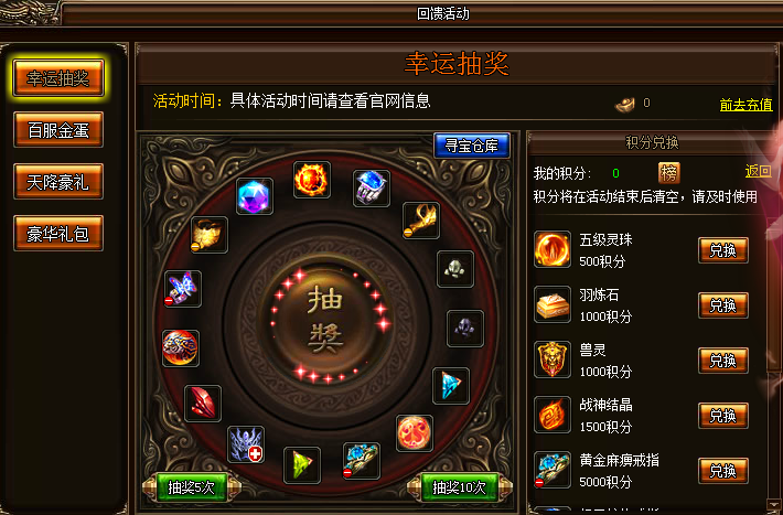 活动详情:活动期间,玩家可在幸运抽奖界面花费一定元宝进行抽奖,每抽奖一次可获得20积分,累积积分可直接兑换稀有物品。