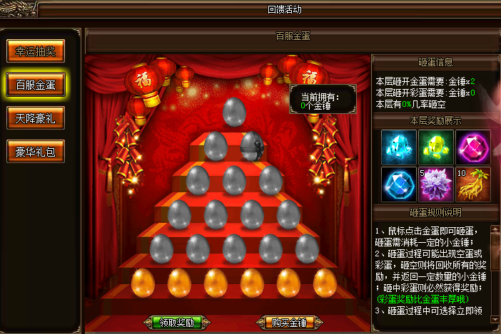 活动详情:活动期间,玩家点击金蛋,购买金锤,可进行砸蛋赢取奖励。砸蛋过程中每层有一定几率出现空蛋或彩蛋,砸空则将回收所有奖励,并返还一定数量小金锤,砸中彩蛋则必然获得大奖。越往上奖励越丰厚哦!砸蛋期间可选择立即领奖,并会返回最底层。