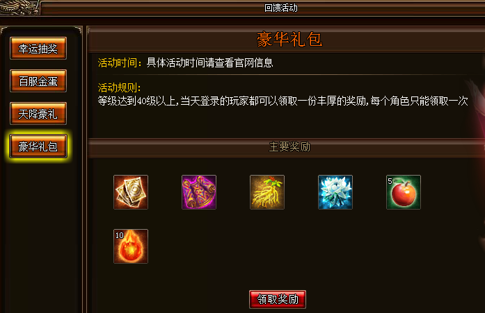 活动详情:活动期间,等级达到40级以上,当天登录的玩家都可以领取一份丰厚奖励,每个角色只能领取一次。