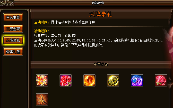 活动详情:活动期间,每天0:45,9:45,12:45,15:45,18:45,21:45,系统将随机抽取5名在线的45级以上玩家发放奖励,奖励物品随机抽取。