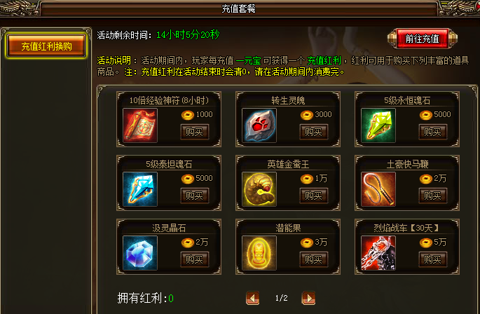活动详情:活动期间,玩家每充值一元宝可获得一个充值红利,红利可用于购买下列丰富的道具商品。活动结束时红利会清0,请在活动期间内消费完。