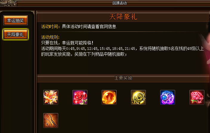 活动详情:活动期间,每天0:45,9:45,12:45,15:45,18:45,21:45,系统将随机抽取5名在线的45级以上玩家发放奖励,奖励物品随机抽取。