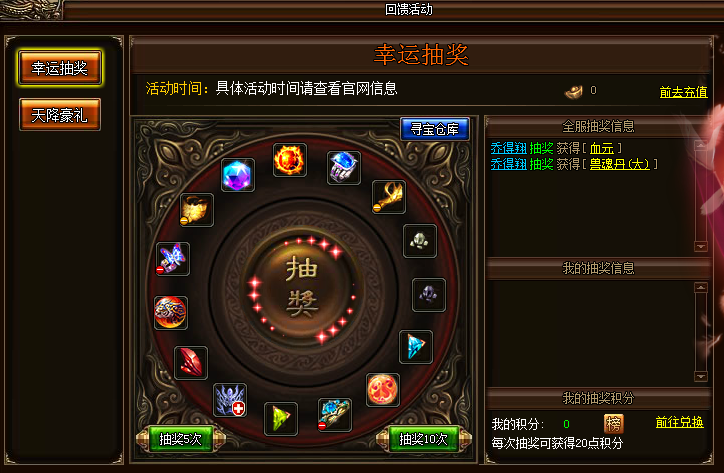 活动详情:活动期间,玩家可在幸运抽奖界面花费一定元宝进行抽奖,每抽奖一次可获得20积分,累积积分也可直接兑换稀有物品。