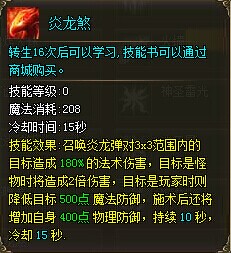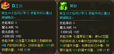 4、新增角色新技能,战士霸王剑、法师炎龙煞、道士冥狱,转生16次后可学习,技能书可通过商城购买。