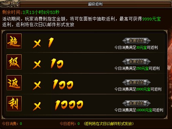 游戏活动区域新增“超级返利”图标,玩家消费满足要求,即可进入点击“我要返利”按钮进行摇奖,返利获得的元宝第二天0点发邮件返还。