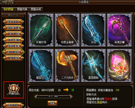 当玩家达到5转50级且激活了今古异志功能,则图鉴界面中的卡牌对战按钮激活,玩家可进行卡牌PK大战。详情请见>>卡牌对战玩法介绍<<