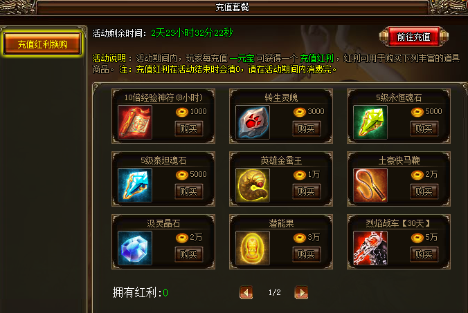 活动详情:活动期间,玩家每充值一元宝可获得一个充值红利,红利可用于购买丰富道具商品。要注意的是,充值红利会在活动结束时清0,请在活动期间内消费完。