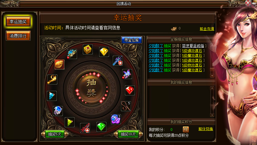 活动详情:活动期间,玩家可在幸运抽奖界面花费一定元宝进行抽奖,每抽奖一次可获得20积分,累积积分也可直接兑换稀有物品。