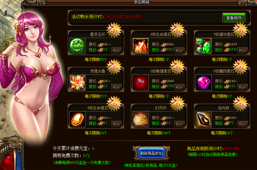 活动详情:活动期间,折扣商城珍宝每2小时刷新一次,低折大放送,最低可1折购买。每天拥有免费刷新折扣次数1次,每消费满500元宝亦可获得一次免费刷新机会,可不断叠加。