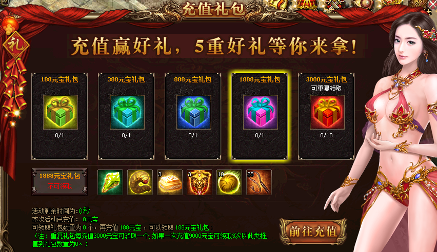 活动详情:活动期间充值达到指定元宝数,即可领取一份对应充值礼包,3000元宝礼包更可重复充值领取10次,每充值3000元宝可领取一个,直到礼包数为0为止。