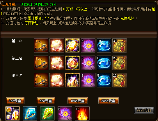 活动期间,玩家每天只要累积提取元宝达到指定数量即可在活动面板领取对应的充值礼包。玩家累计提取元宝达到10万或以上即可参与充值排行榜,活动结束时充值排行前三名玩家可获得丰富奖励。