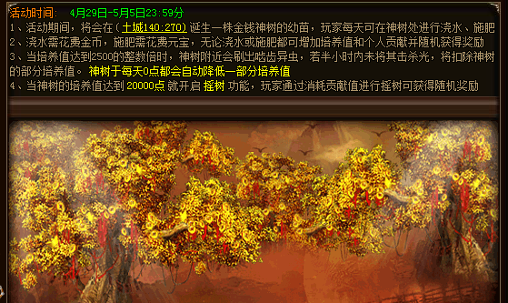 a) 活动期间将会在土城(140:270)处出现一株金钱树幼苗,每天可点击神树进行浇水、施肥操作。