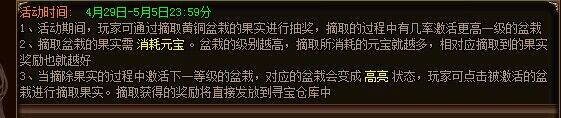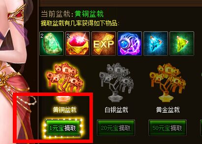 b) 初始抽奖为黄铜盆栽,黄铜盆栽摘除需消耗1元宝才能摘除,摘取抽奖后有几率激活高一级的盆栽,如此类推,盆栽等级越高奖励越丰富。