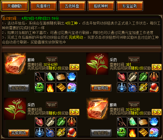 活动开始后,系统会在面板随机刷出4份工种,可以通过刷新按钮刷新工种,共有搬砖、采药、运货、采矿、打造、耕耘6个工种,劳动时间和奖励依次向上递增。点击开始劳动,时间完成后即可领取奖励,注意领取奖励需要角色达到50级或以上,奖励直接放入背包中。