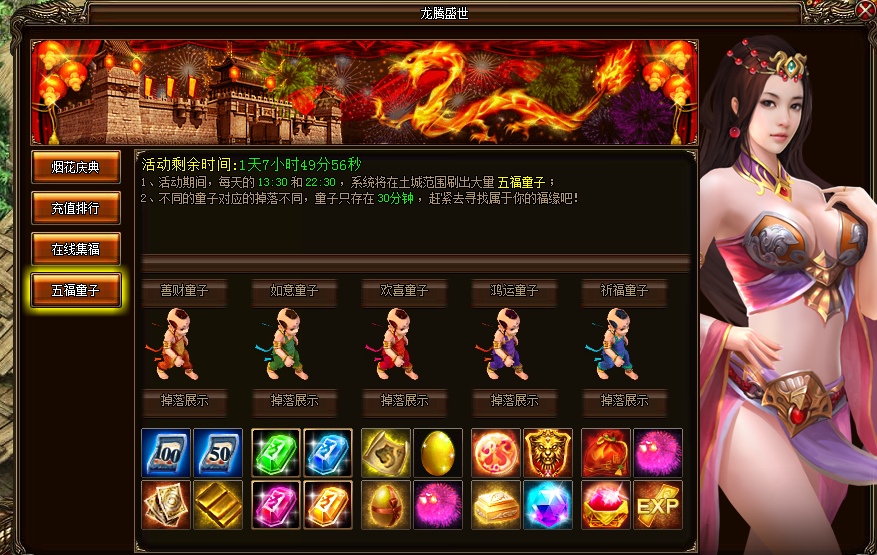 活动详情:活动期间,每天的13:30和22:30,系统将在土城范围内刷出大量五福童子;玩家可在土城自行寻觅童子的身影,并挑战童子;不同的童子对应不同的奖励,击败童子可获得丰厚奖励哦。