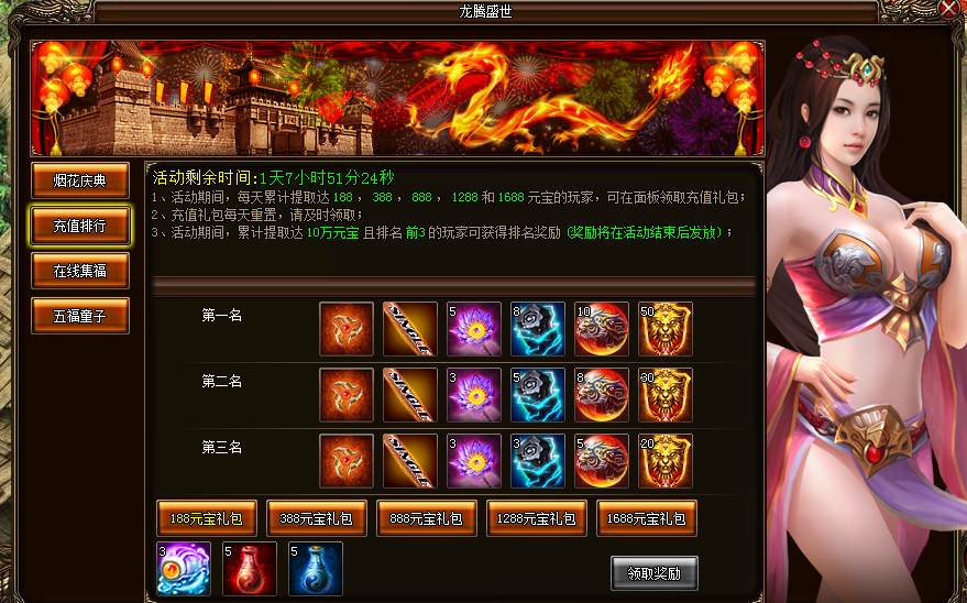 活动详情:活动期间,每天累计提取达到一定元宝数的玩家可在活动面板领取充值礼包奖励,奖励每天重置,记得及时领取。活动期间累计提取达10万元宝且排名前3的玩家还可获得排名奖励。