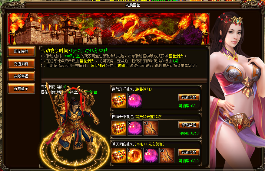 活动详情:活动期间50级以上的玩家可以通过领取活动礼包,击杀活动怪物等方式获得盛世烟火。在任意地点双击燃放盛世烟火,将可获得一定奖励,且使本服的烟花指数上升1点,当烟花指数达到一定值时,盛世神君将在土城附近等待玩家挑战,战胜神君可掉落丰厚奖励。
